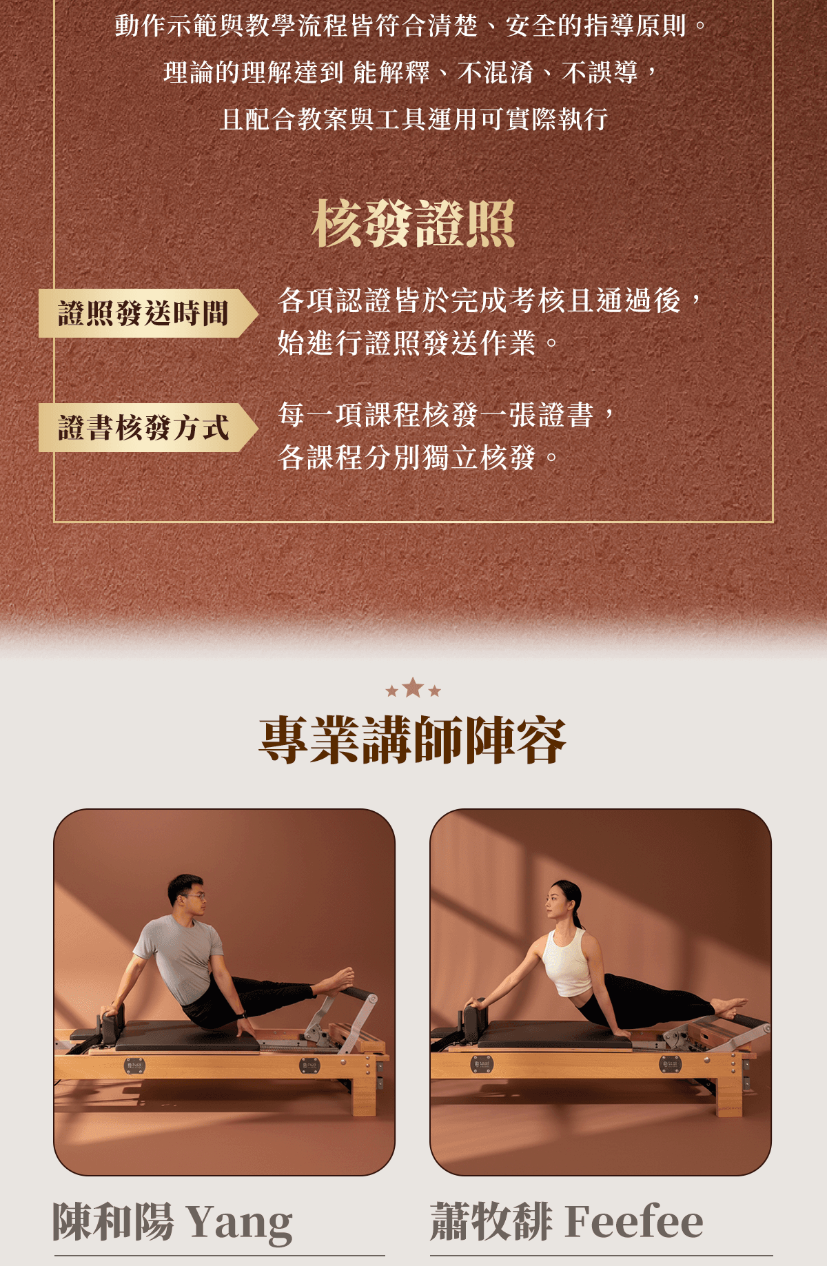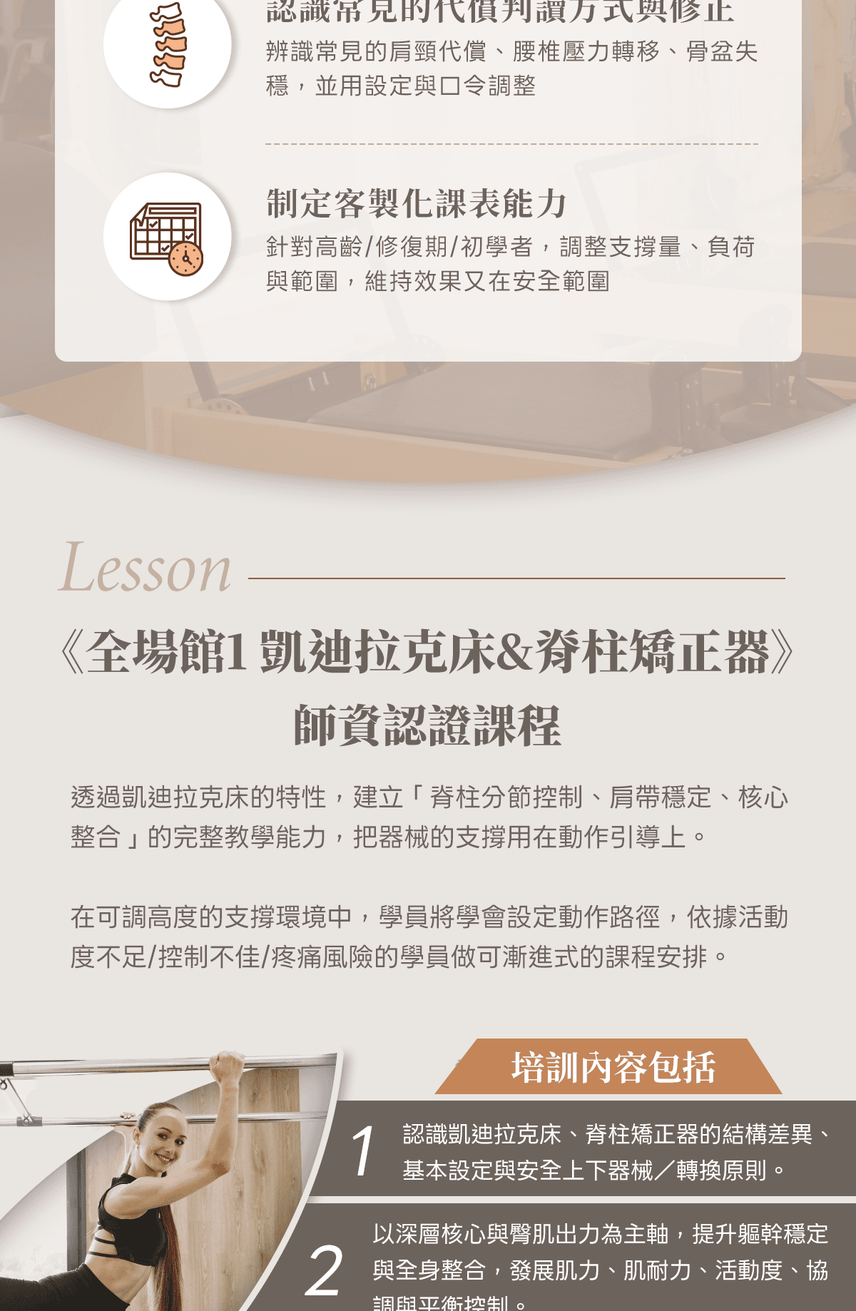 透過凱迪拉克床的特性,建立「脊柱分節控制、肩帶穩定、核心整合」的完整教學能力,把器械的支撐用在動作引導上。