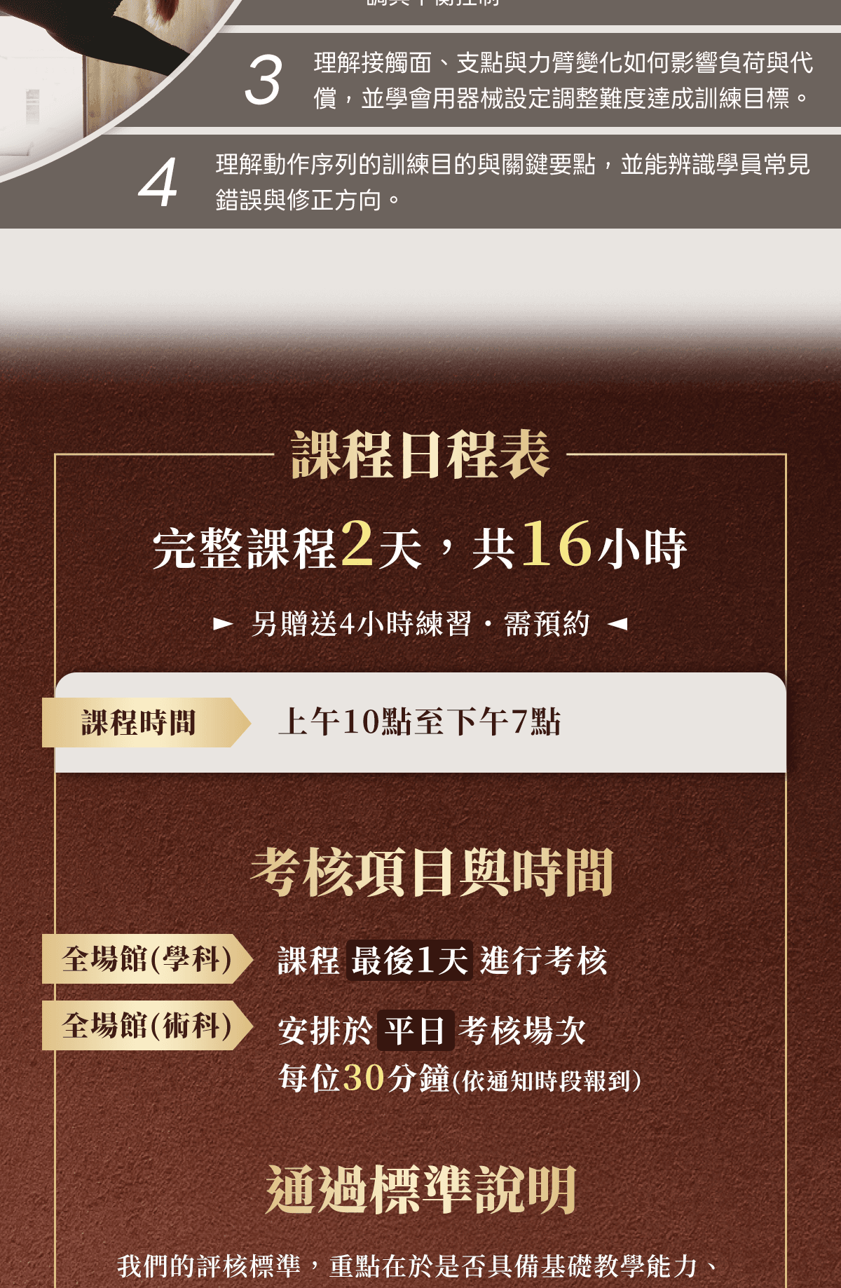 我們的評核標準,重點在於是否具備基礎教學能力、動作示範與教學流程皆符合清楚、安全的指導原則。
