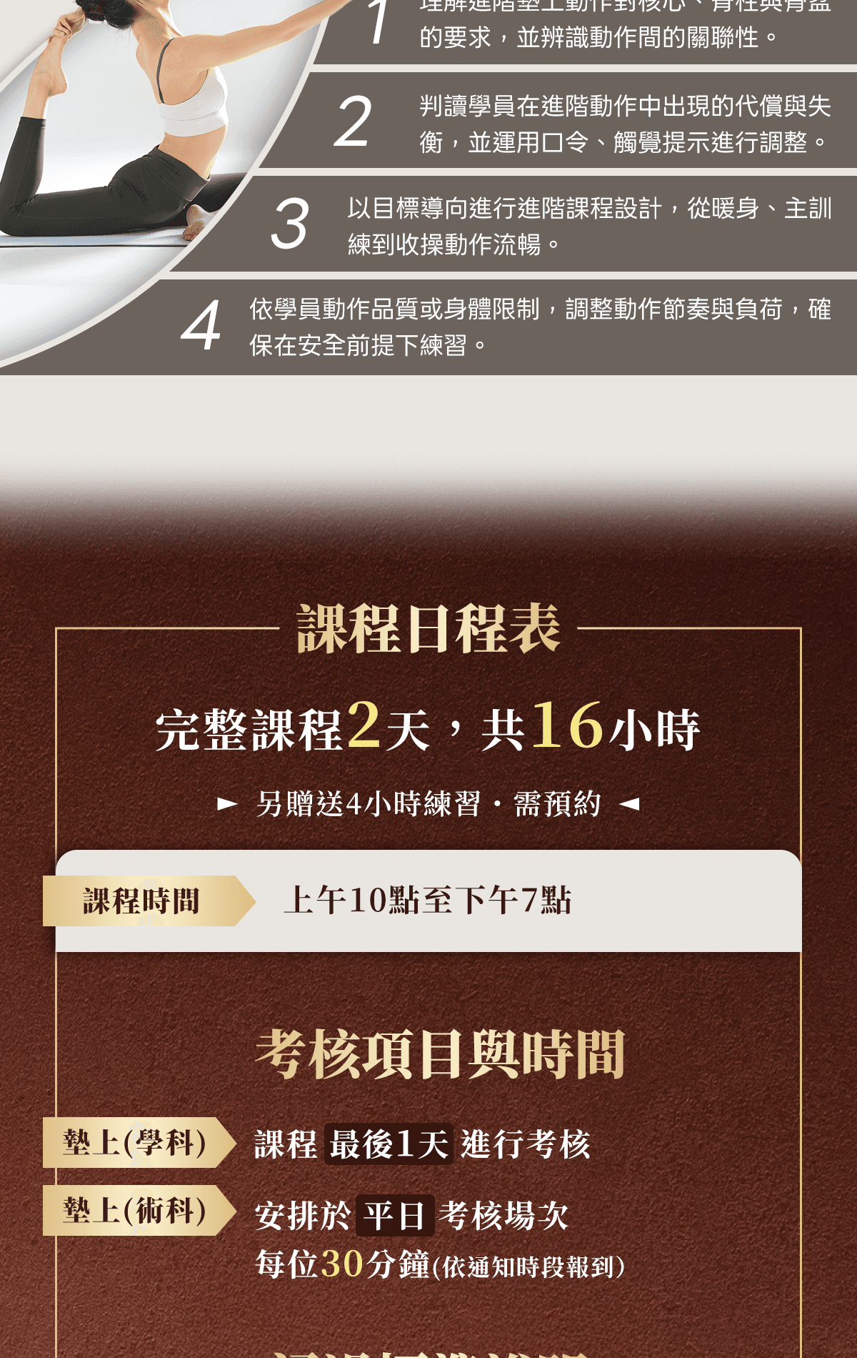 1. 理解進階墊上動作對核心、脊柱與骨盆的要求,並辨識動作間的關聯性。