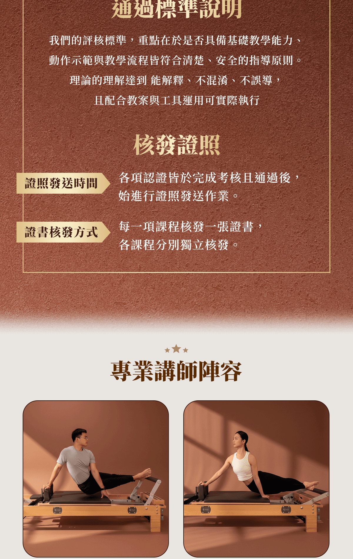 我們的評核標準,重點在於是否具備基礎教學能力、動作示範與教學流程皆符合清楚、安全的指導原則。