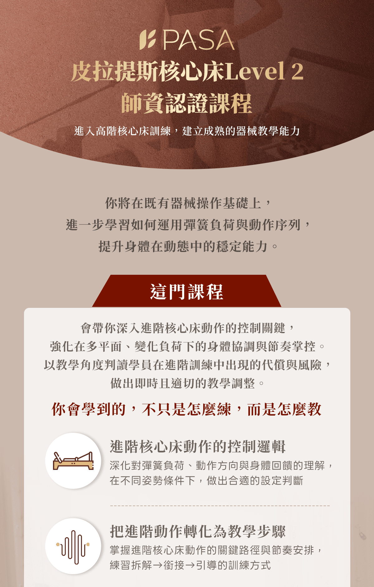 核心床 Level 2 課程著重於如何在變化負荷與複雜動作條件下,維持動作品質與教學掌控力。