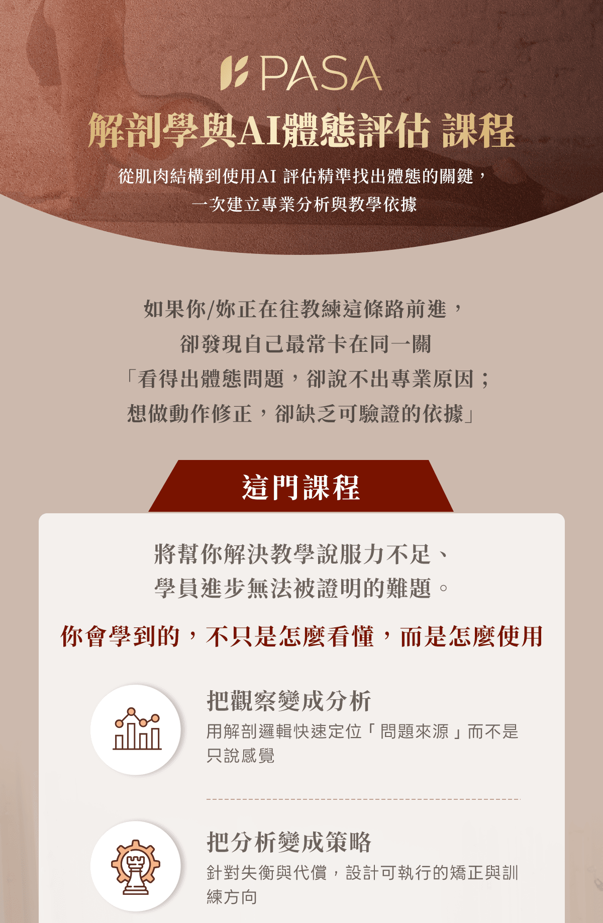 很多人其實都能看出學員有圓肩、骨盆前傾、左右不對稱或代償的動作,但如果沒有肌肉解剖基礎依據,調整往往只能停留在「提醒收核心、肩膀放鬆」這種較通一般的口令引導,一方面學員做不出來、一方面你也很難知道學員卡在哪個環節,最後不只進步慢,還可能把代償練得更固定。