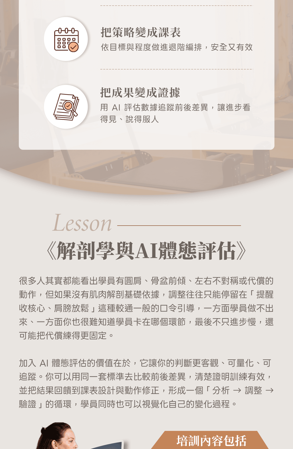 加入 AI 體態評估的價值在於,它讓你的判斷更客觀、可量化、可追蹤。你可以用同一套標準去比較前後差異,清楚證明訓練有效,並把結果回饋到課表設計與動作修正,形成一個「分析 → 調整 → 驗證」的循環,學員同時也可以視覺化自己的變化過程。